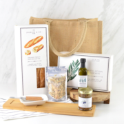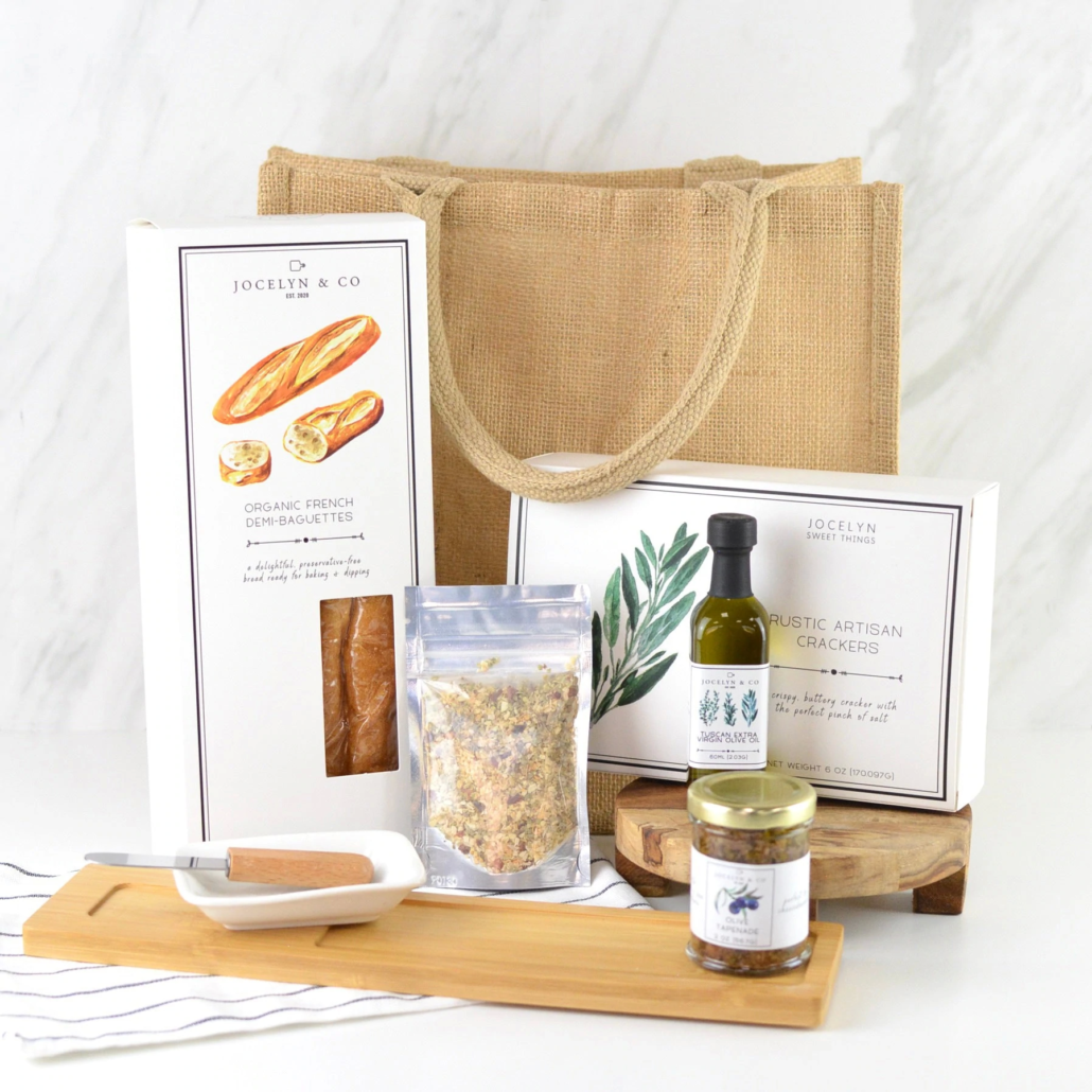 All carefully tucked into a jute tote is a pair of our French demi baguettes, rustic artisan crackers, Tuscan virgin olive oil, Italian dipping spices, olive tapenade, mini knife spreader with a bread board and white dipping dish.
