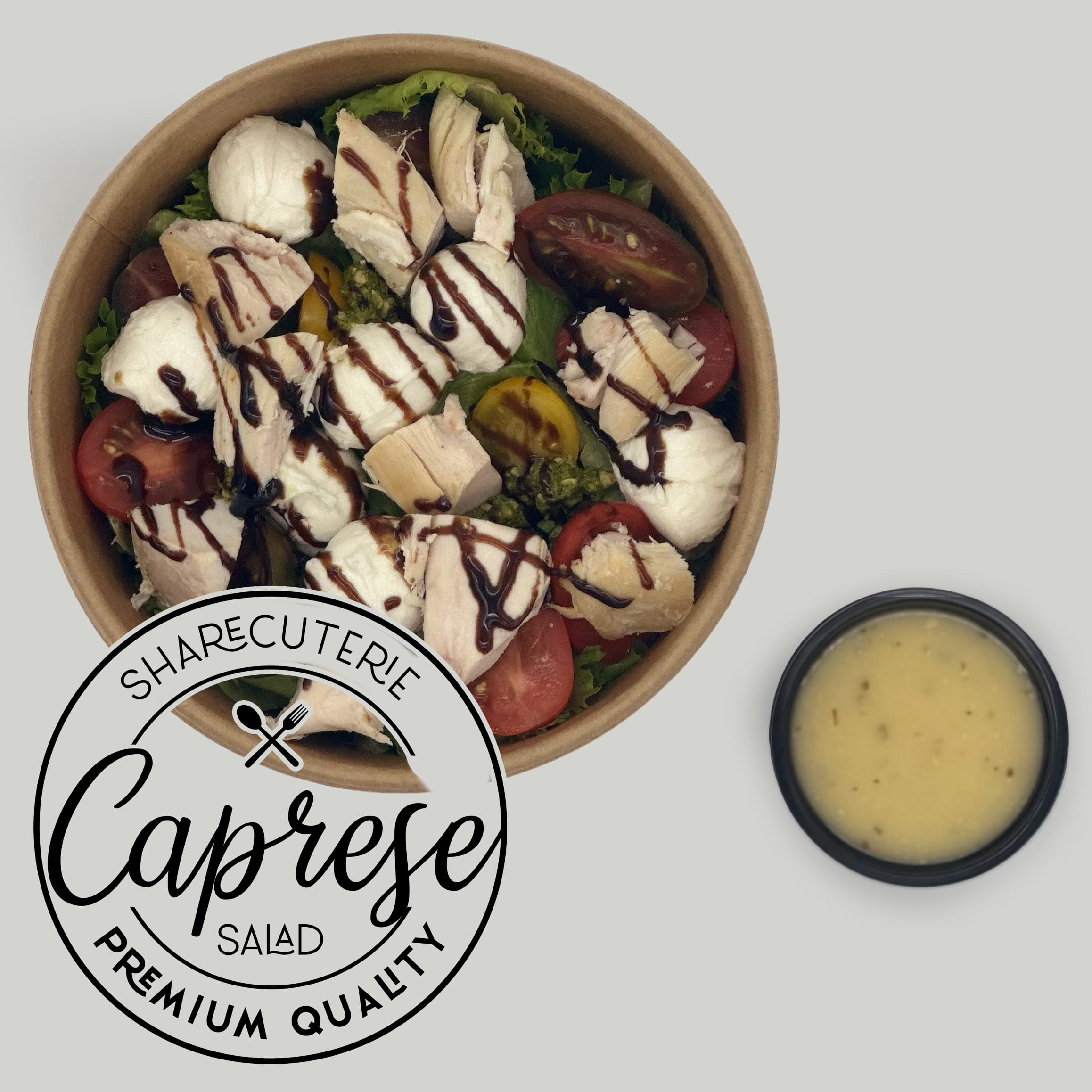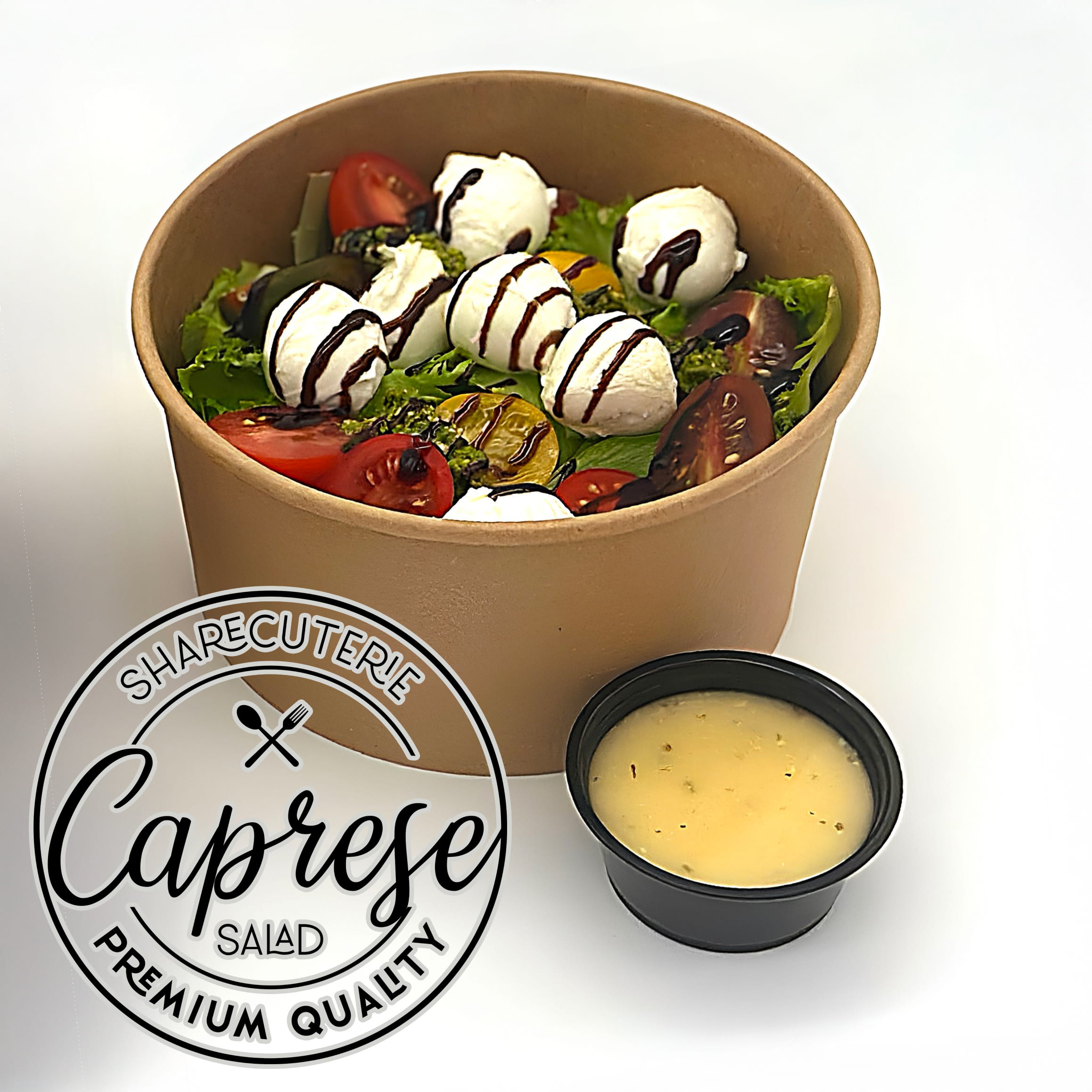 A fresh twist on the beloved Italian classic. Our Sharecuterie Caprese Salad features creamy fresh mozzarella pearls and vibrant heirloom tomatoes layered over crisp, locally grown Summer Crisp lettuce. The salad is finished with a fragrant pesto drizzle, a touch of sea salt, and a rich balsamic glaze that ties the flavors together beautifully. Served with a side of creamy Italian dressing for the perfect finishing touch.
