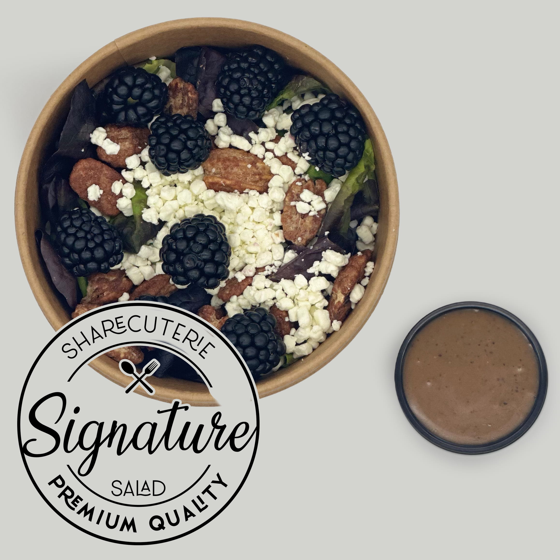 The salad that helped put our catering menu on the map. This signature creation begins with delicate baby red butter lettuce, then layers in creamy crumbled goat cheese, farm-fresh ripe blackberries, and sweet, crunchy praline pecans for a beautiful balance of flavors and textures. Served with our house creamy balsamic dressing, it’s light, crisp, and irresistibly delicious.